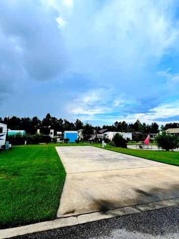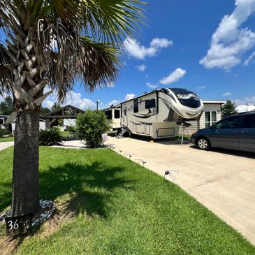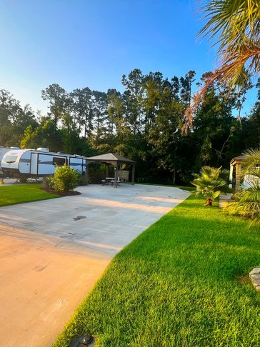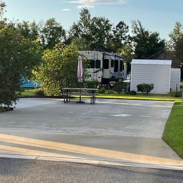 60 X 80 lot size with a 40 X X 60 Concrete Parking area with plenty of room for 2 vehicles and golf cart etc. Also a 10 x 20 extra picnic/hang out area